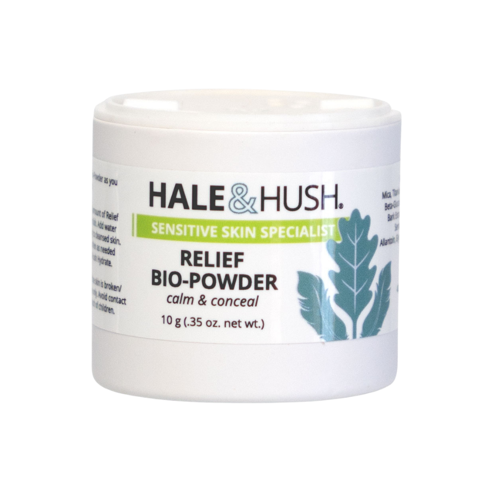Calm and conceal. Two powerful benefits from one amazing product. Relief Bio-Powder is an expert blend of eight botanical extracts that make this powder a powerful dermatologist-tested, sensitive skin aid. It works in multiple ways…. dry, as a paste (just add water), or mixed with other Hale & Hush products. No matter how it’s put to work, it will accomplish the task. Relief Bio-Powder has fast-acting abilities to quickly rescue skin that is under attack from redness, irritation, and itchiness. Bothered and irritated skin can be, well, bothersome and irritating. Put up a fight against inflammation, redness, and itchiness with a powder that’s up for the challenge. Use it as a powder to immediately conceal and calm redness. Mix with multiple Hale & Hush products for wildly wonderful and fast acting results.
